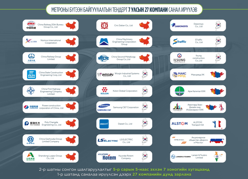 Twenty-seven companies from seven countries, including Mongolia, the Republic of Korea, the United Kingdom, the Russian Federation, the French Republic, the Republic of India, and the People's Republic of China, submitted proposals. Under the law, the second-stage tender will be announced on May 5, 2025. The metro line will run from Tolgoit to Amgalan.