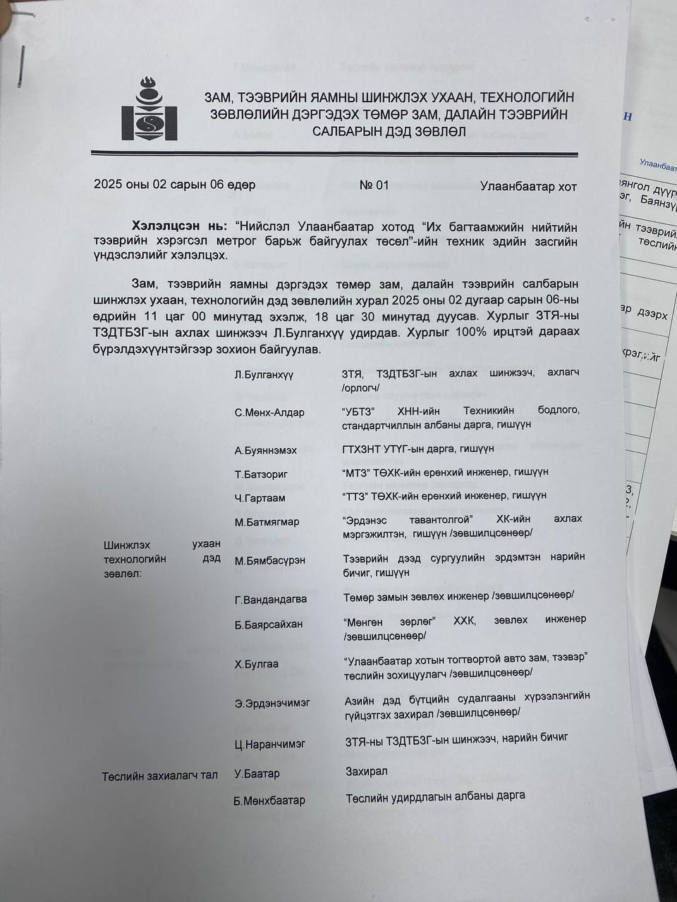 For example, geological drilling was carried out at 42 points in Ulaanbaatar city, at a depth of 30 m every 500 m along the metro route, and a basic analysis with soil samples was conducted. In addition, data analysis was conducted based on hydrogeology, environmental status assessment, passenger traffic research, and transport demand research, and the newly developed Feasibility Study was discussed by the Railway and Maritime Transport Sector Subcommittee under the Science and Technology Council of the Ministry of Roads and Transport.