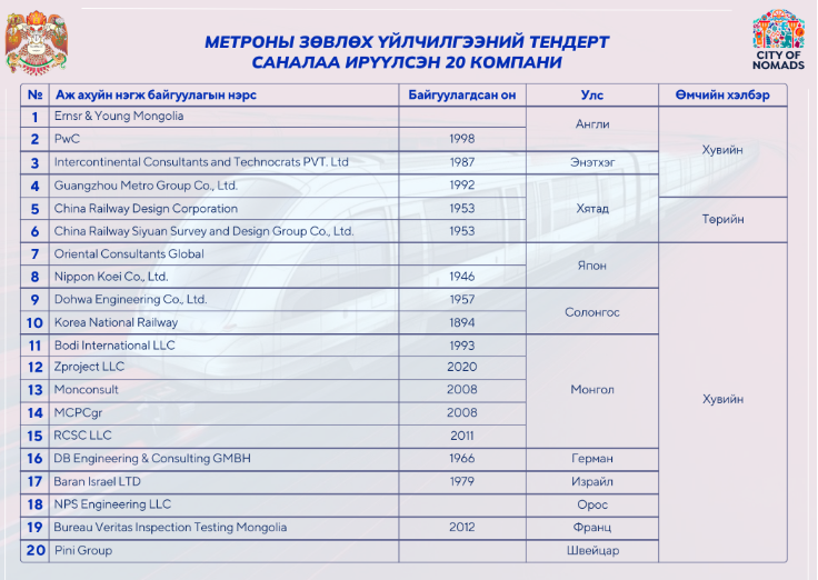 Тэрбээр “Улаанбаатар хотод их багтаамжийн нийтийн тээврийн хэрэгсэл буюу метро барих төслийн зөвлөх үйлчилгээ үзүүлэх олон улсын нээлттэй тендерийн нэгдүгээр үе шатанд Англи, Энэтхэг, Хятад, Япон, Өмнөд Солонгос, Герман, Франц, Швейцар, Израил, Орос, Монгол буюу нийт 11 улсын 20 компани саналаа ирүүлжээ. Өнөөдөр Үнэлгээний хороо хуралдаж, саналаа ирүүлсэн 20 компанид энэ сарын 25-ны өдөр хоёрдугаар үе шатны урилга хүргүүлэх юм. Худалдан авах ажиллагааны тухай хуулийн дагуу гуравдугаар сарын сарын 25-наас хойш ажлын 20 хоногт багтан энэ 20 компанийн нэг нь Улаанбаатар метроны зөвлөх үйлчилгээний багаар шалгарна. Улмаар тус баг Улаанбаатар хотын метроны зураг төслийг боловсруулах, барилга угсралтыг хийж гүйцэтгэх компанийн тендерийн жишиг баримтыг боловсруулж бидэнд хүлээлгэн өгнө. Үүний дагуу бид хоёрдугаар үе шат болох үндсэн гүйцэтгэгчийг сонгон шалгаруулах олон улсын нээлттэй тендерийг зарлах юм. Метроны төслийг сонгууль угтсан суртал ухуулга гэх зэргээр улстөржихгүй байхыг хүсэж байна” хэмээв.
