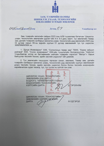 Их багтаамжийн нийтийн тээврийн хэрэгсэл “Метро”-г барих төслийн зөвлөх үйлчилгээний гүйцэтгэгчээр БНСУ-ын Dohwa Engineering Co.Ltd болон “Korea National Railway”, “Soosung Engineering”, “Korea Railroad Corporation” түншлэл шалгарч, энэ хүрээнд Жайкагийн 2013 онд боловсруулсан Техник, эдийн засгийн үндэслэл /ТЭЗҮ/-ийг иж бүрнээр шинэчлэх, Инженер-геологи болон бусад суурь судалгааны нийт 6 ажлыг хийж гүйцэтгээд байна. Тухайлбал, геологийн өрөмдлөгийн ажлыг Улаанбаатар хотын 42 цэгт буюу метроны трассын дагуу 500 м тутамд 30 м-ийн гүнд өрөмдлөг хийж, хөрсний дээж бүхий суурь шинжилгээг хийсэн. Мөн гидрогеологи, байгаль орчны төлөв байдлын үнэлгээ, зорчигч хөдөлгөөний судалгаа, тээврийн эрэлтийн судалгааны үндсэн дээр дата анализ хийж, шинэчлэн боловсруулсан ТЭЗҮ-ийг холбогдох яамдын мэргэжлийн зөвлөлөөр хэлэлцүүллээ.