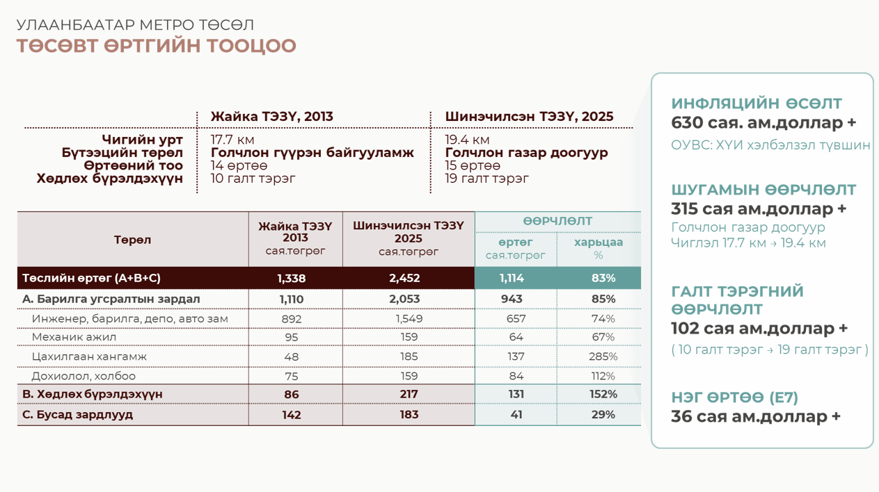 Шинэчилсэн 2025 оны ТЭЗҮ-д метро нь бүх уртаараа газар доогуур явах бөгөөд хотын захад зөвхөн газрын түвшинд гарч ирдэгээр төлөвлөгдсөн. Энэ нь улмаар хөрөнгө оруулалтын үр ашгийг нэмэгдүүлж, эдийн засгийн давуу талыг бий болгоход чиглэгдсэн.
