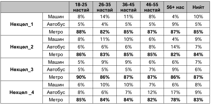 Метроны нөхцөлийн үнэлгээ болон үнийн талаарх хүлээлт: Уг судалгааны хүрээнд иргэдэд метроны талаарх мэдээллийг өгч, 4 ялгаатай нөхцөлийг танилцуулж тухайн нөхцөлд автомашин, автобус, метроны алийг нь сонгож зорчих хүсэлтэй байгаа тодруулсан. Эдгээр 4 ялгаатай нөхцөл бүрийн хувьд метро үйлчилгээг сонгоно гэж нийт иргэдийн 83-аас дээш хувь нь хариулжээ. Ялангуяа нөхцөл 3-ийн хувьд 87 хувь нь метрог сонгон зорчилтыг хийнэ гэж хариулсан нь хамгийн өндөр үзүүлэлт болж байна. Эдгээр үнэлгээ нь насны бүлэг, хүйс, ажил эрхлэлтээс зэргээс хамаарсан хүчтэй ялгаа байхгүй байна.