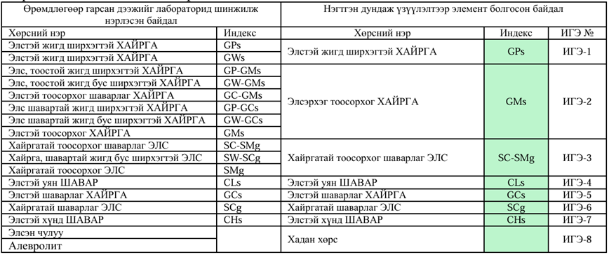 Хөрсний физик, механик шинж чанарыг тодорхойлох зорилгоор өрөмдлөгийн явцад 362 дээж, хөрсний даацат чанар, хамгийн их нягт, тохиромжтой чийгийг тодорхойлох CBR, прокторын туршилт хийх 15 бөөн дээж авч Экотех проект ХХК-ийн MNS/ISO 17025 “Буурь хөрс” ХХК Улаанбаатар хотод Их багтаамжтай нийтийн тээврийн хэрэгсэл “Метро” барихаар төлөвлөж буй трассын дагуух талбайн ИГС 6 итгэмжлэгдсэн хөрс судлалын лабораторид болон туслах 2 хөрс судлалын лабораторид /Буурь хөрс ХХК, Экогидрогео ХХК-уудын/ туршилт шинжилгээг дараах стандартуудын дагуу хийж гүйцэтгэн холбогдох үзүүлэлтүүдийг тодорхойлсон болно. Үүнд: