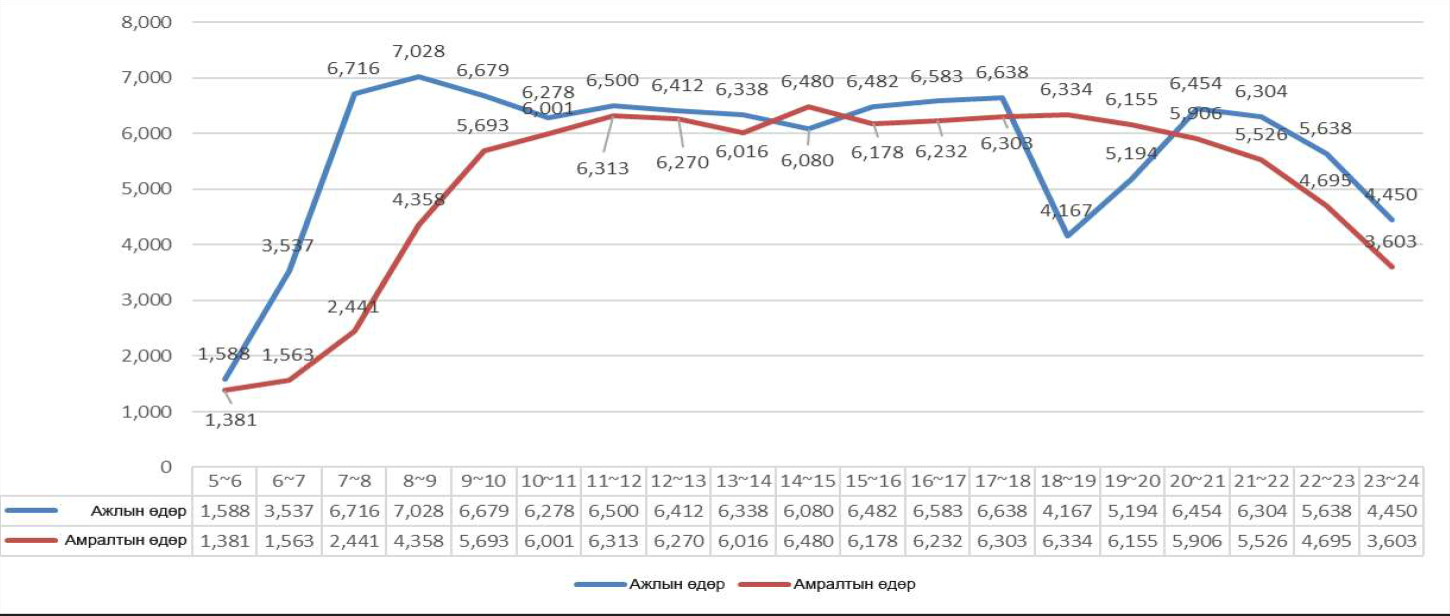 Харин амралтын өдөр 11:00–12:00 цагийн хооронд хамгийн их буюу 64,360 машин/цагийн эрчимтэй байжээ.