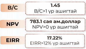 Эдгээр үзүүлэлтүүд нь төслийн эдийн засгийн үр өгөөж өндөр буюу төслийг хэрэгжүүлэх нь зүйтэйг илтгэж байна.