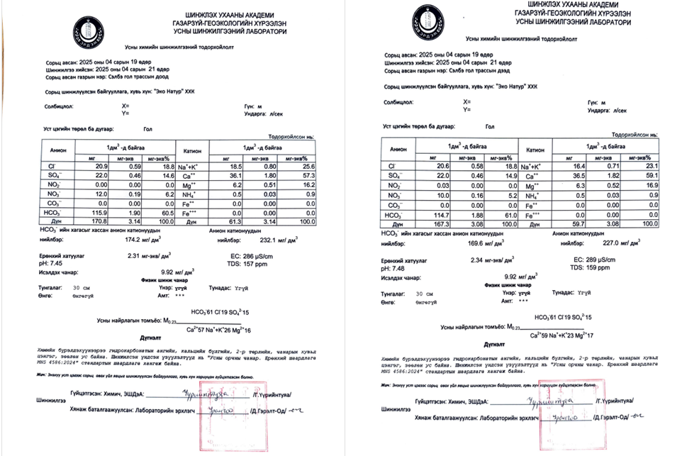Дүгнэлт: Сэлбэ голын дээд хэсгийн дээж нь химийн бүрэлдэхүүнээрээ гидрокарбонатын ангийн, кальцийн бүлгийн, 2-р төрлийн, чанарын хувьд цэнгэг, зөөлөн ус байна. Шинжилсэн үндсэн үзүүлэлтүүд нь “Усны орчны чанар. Ерөнхий шаардлага MNS 4586:2024” стандартын шаардлага хангаж байна.