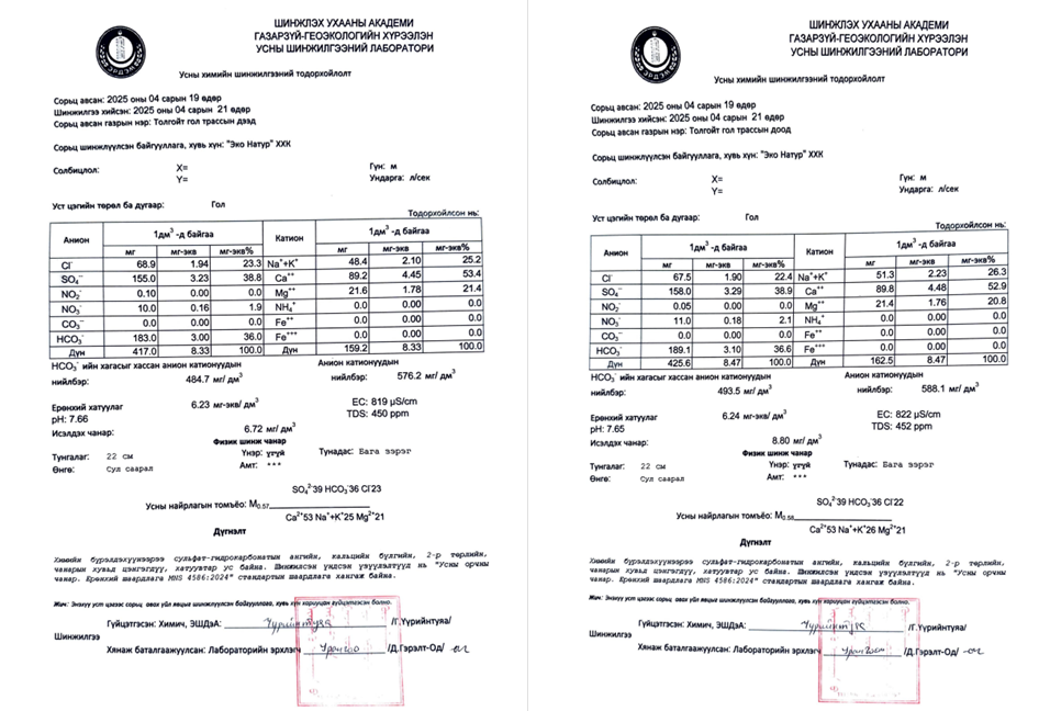 Дүгнэлт: Толгойт голын доод хэсгийн дээж нь химийн бүрэлдэхүүнээрээ сульфат-гидрокарбонатын ангийн, кальцийн бүлгийн, 2-р төрлийн, чанарын хувьд цэнгэгдүү, хатуувтар ус байна. Шинжилсэн үндсэн үзүүлэлтүүд нь "Усны орчны чанар. Ерөнхий шаардлага MNS 4586:2024" стандартын шаардлага хангаж байна.