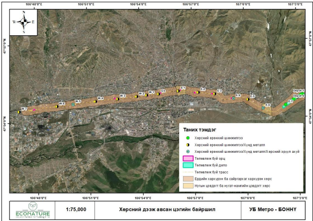Судалгааны бэлтгэл ажлын хүрээнд Google Earth мэдээллийн сан, сансрын зураг болон байр зүйн суурь зураглалыг ашиглан Депо барих талбайн хөрсний тархалт, зонхилох хэв шинжийг тодорхойлж, сорьц авах цэгүүдийг урьдчилан тогтоов.