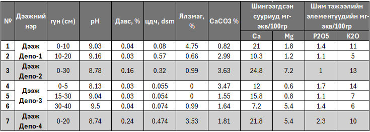 Дүгнэлт: Төсөл хэрэгжих талбайн хөрс нь хотын суурьшлын бүсийн нөлөөгөөр өөрчлөлтөд орсон, шүлтлэг шинж чанар давамгайлсан үзүүлэлттэй байна.