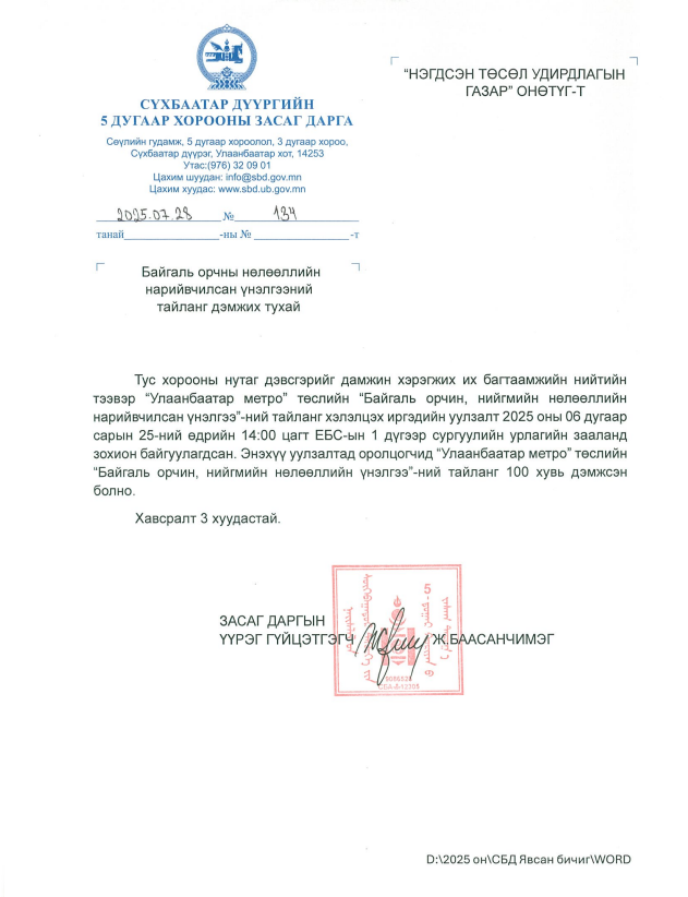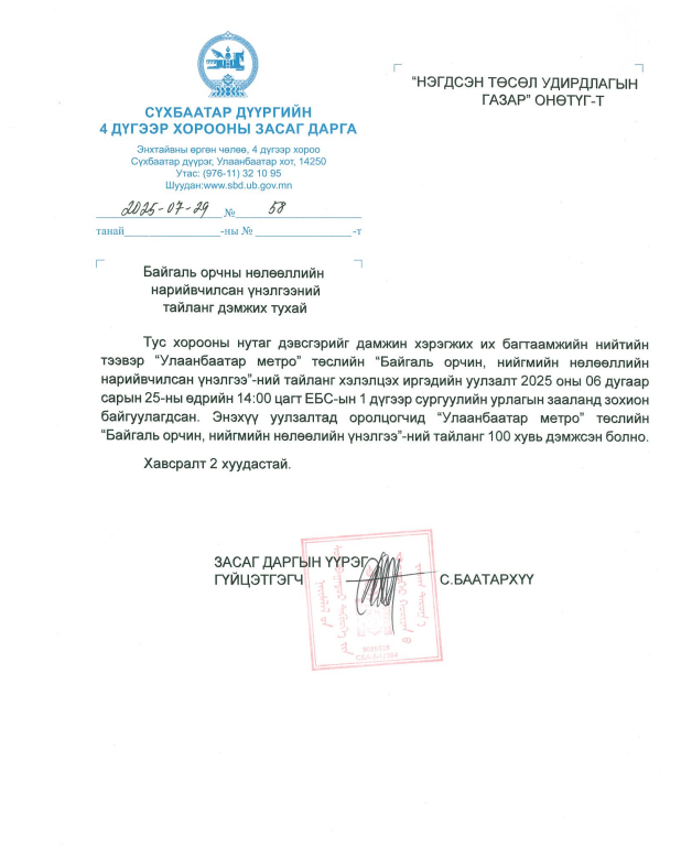 УЛААНБААТАР МЕТРО БА ИРГЭД: БОННҮ ТАЙЛАНГ СҮХБААТАР ДҮҮРГИЙН ИРГЭДЭД ТАНИЛЦУУЛЛАА