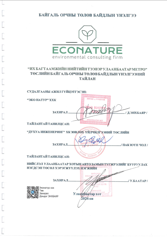 Мөн судалгаагаар төслийн талбай нь Туул голын сав газарт хамаарах бөгөөд ойролцоогоор 2 км зайд байрлаж байгаа ч одоогийн нөхцөлд гадаргын усанд сөрөг нөлөөлөл илрээгүй байна. Түүнчлэн газар хөдлөлтийн идэвхжил, хөрсний бүтэц, усны нөхцөл, геоморфологийн онцлог зэрэг байгалийн хүчин зүйлсийг тодорхойлж, цаашдын зураг төсөл, инженерийн шийдэлд ашиглах суурь мэдээллийг бүрдүүлсэн байна.