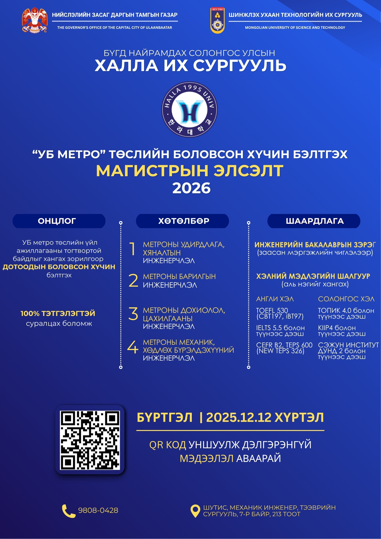 Нийслэлийн Засаг Даргын Тамгын газар, Шинжлэх Ухаан Технологийн Их сургууль болон БНСУ-ын Халла их сургууль хамтран “УБ метро” төслийн хүрээнд инженер, мэргэжилтэн бэлтгэх “2+2” хөтөлбөрийг хэрэгжүүлж байна. Энэхүү хөтөлбөрийн хүрээнд дараах мэргэжлээр МАГИСТР-ын элсэлт авч байна.