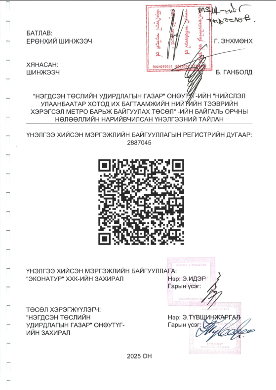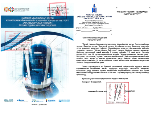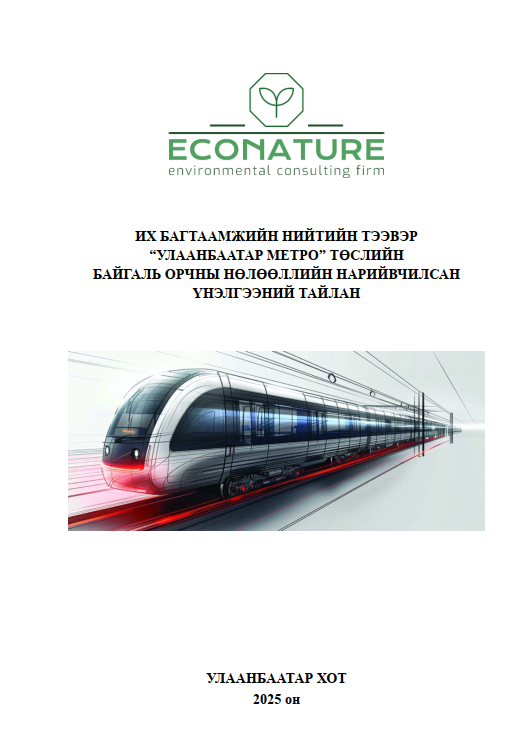 Техник эдийн-засгийн үндэслэл, БОУАӨЯ-ны 12/3400 тоот бүхий ерөнхий үнэлгээний дүгнэлтийг үндэслэж “Нийслэл Улаанбаатар хотод их багтаамжийн нийтийн тээврийн хэрэгсэл Метро барьж байгуулах” төслийн БОННҮ тайланг боловсруулав.