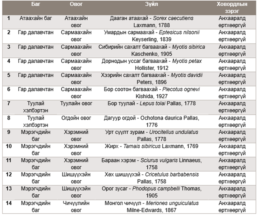 Төсөл хэрэгжүүлэх талбайд тохиолдох боломжит хөхтөн амьтдын зүйлийн жагсаалт