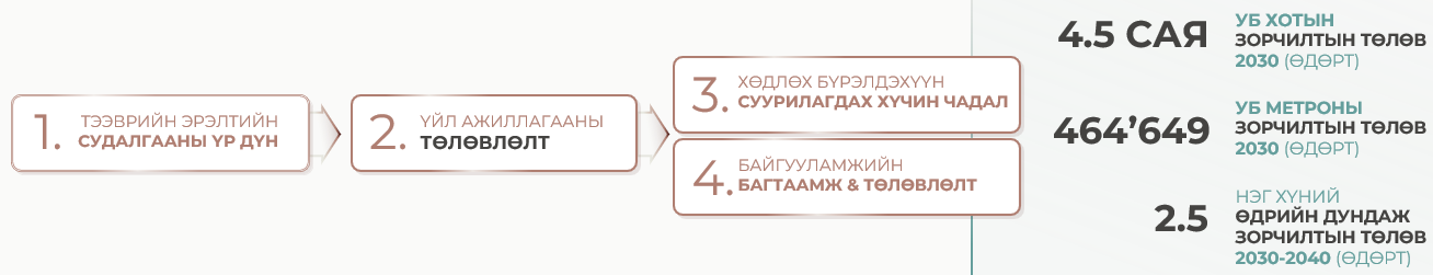 Урьдчилсан тооцооллоор 2030 онд Улаанбаатар хотод өдөрт 4.5 сая зорчилт хийгдэхээр байгаа бөгөөд үүний 464,649 нь УБ метроны зорчилт болох юм. Уг тээврийн эрэлтийн судалгааг 1. Зорчилт хөдөлгөөний судалгаа (Улаанбаатар хотын зорчилтын төлөв, Тасалбарын үнэ), 2. Хурдны судалгаа (Улаанбаатар хотын гол гудамж замын дундаж хурд), мөн 3. Хөдөлгөөний эрчмийн судалгаа (Улаанбаатар хотын авто замын хөдөлгөөний ачаалал)-нуудыг уялдуудан хийсэн болно. Хөдлөх бүрэлдэхүүний хүчин чадал ба байгууламжийн төлөвлөлт зорчигчдын тооноос шууд хамааралтай юм.