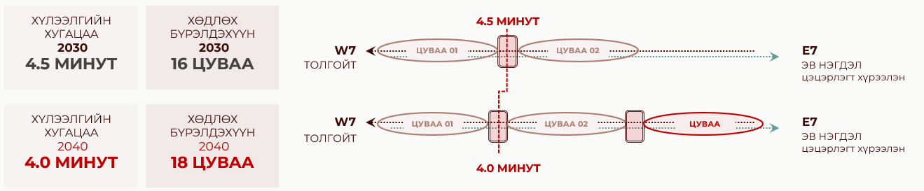 2030 оны буюу Метро ашиглалтанд орж эхэлсэн үед хүлээлтийн хугацаа 4.5 минут байх бөгөөд 2040 онд 4.0 минут болж богиносохын зэрэгцээ хөдлөх бүрэлдэхүүний цувааны тоо нэмэгдэнэ.