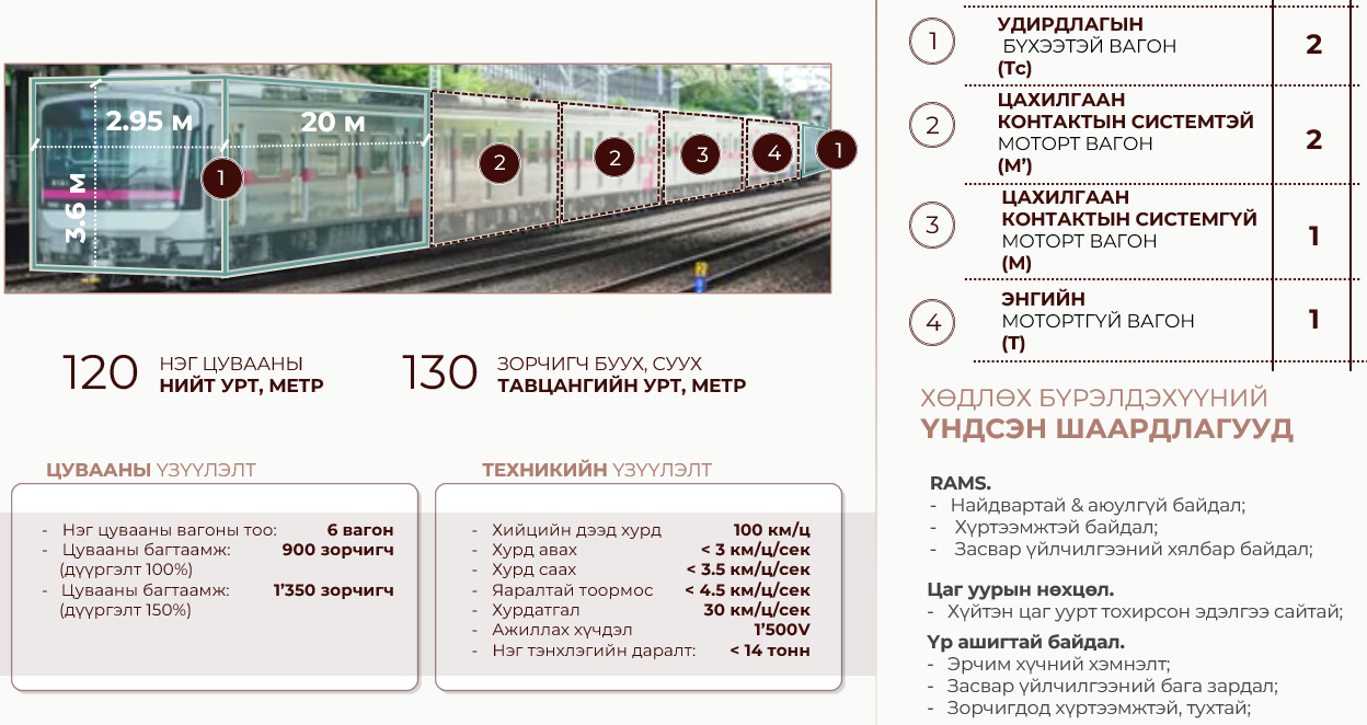 Нэг вагоны урт- 20 метр ба 6 вагон нийлээд 120 метро бүхий нэг цувааг бүрдүүлнэ. Үүнээс хамаараад өртөөний В-3 давхарт байрлах тавцангийн урт нь 130 метр байна.