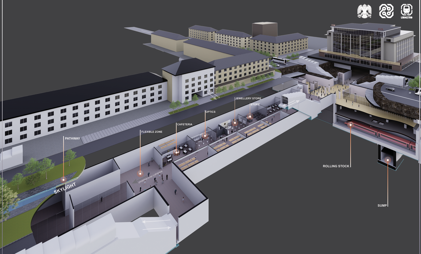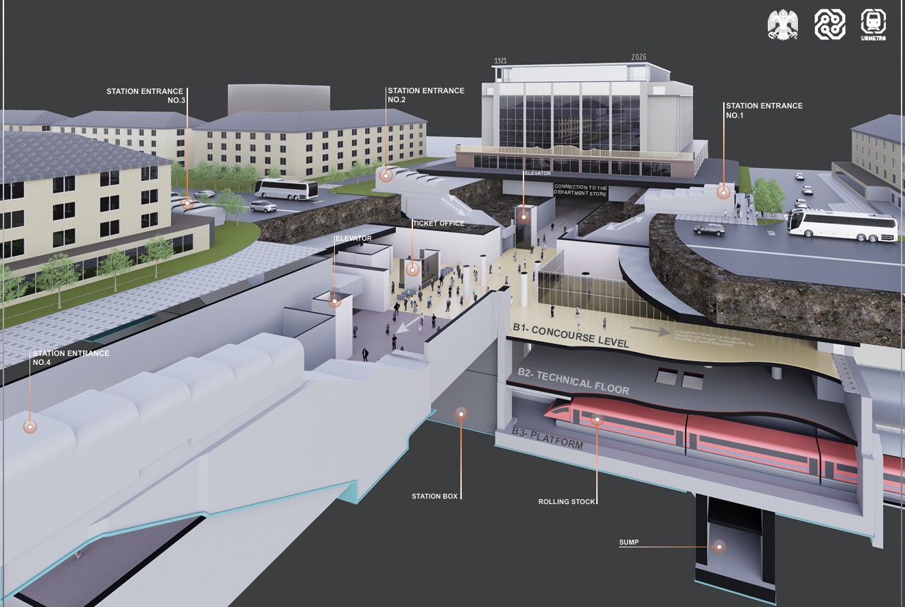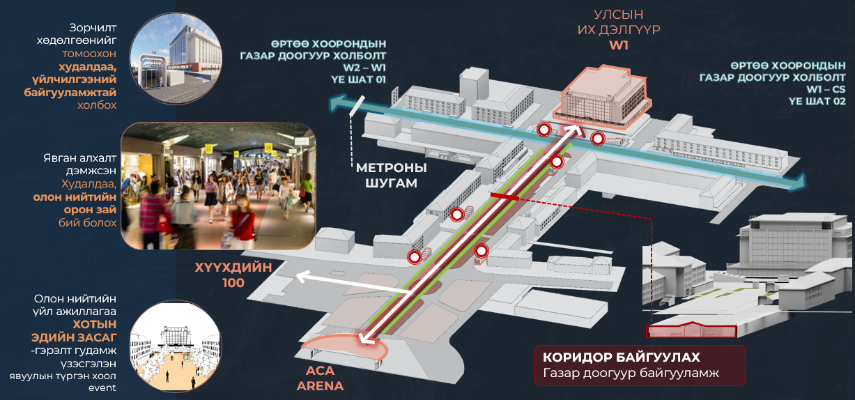 Их дэлгүүр ба ASA Arena хоорондын W1 өртөөний В-1 давхарыг дамжин өнгөрөх газар доорх явган алхалтын коридорын концепц зураг. Энэ нь УБ метро төслөөс тусдаа TOD төсөл байх бөгөөд Төр, Хувийн Хэвшлийн Түншлэл (ТХХТ)-р хэрэгжих төлөвлөгөөтэй. Тус холболт нь зөвхөн алхалтын орон зай биш, олон төрлийн жижиглэн худалдаа, үйлчилгээний коридор болох потенциалтай юм.