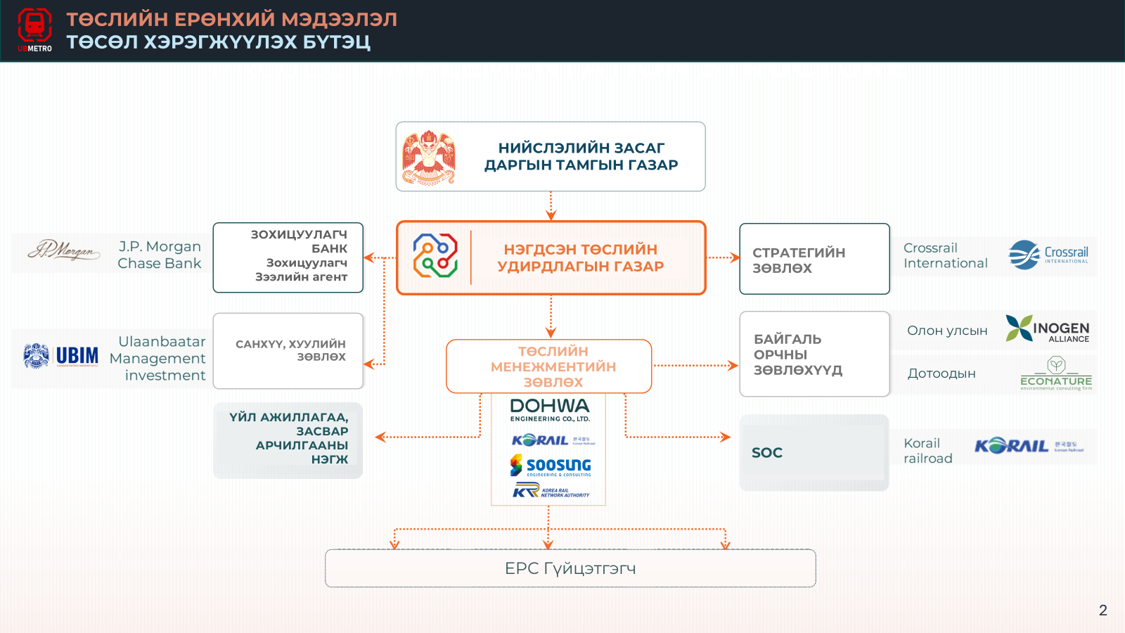 Улаанбаатар Метро төслийн санхүүжилтийн зохих хувийг олон улсын эх үүсвэрээс шийдвэрлэх чиглэлд санхүүгийн болон хуулийн зөвлөхөөр Нийслэлийн өмчит "Улаанбаатар хөрөнгө оруулалт, менежмент ҮЦК" ХХК нь 2025 оноос эхлэн ажиллаж эхэлсэн.