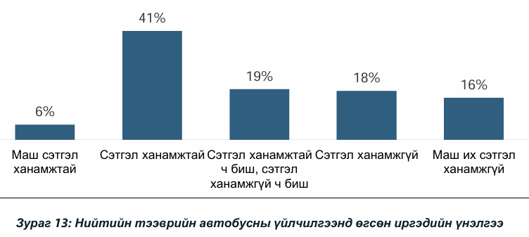 Улаанбаатар хотын тээврийн дэд бүтцийн нөхцөл байдалд хэр сэтгэл хангалуун байгааг судалгаанд оролцогч нараас тодруулахад, 26 хувь нь сэтгэл ханамжтай гэж хариулсан бол талаас илүү хувь буюу 62 хувь нь сэтгэл ханамжгүй гэж хариулсан байна. Өөрөөр хэлбэл, 5 хүн тутмын 3 нь сэтгэл ханамжгүй байна.