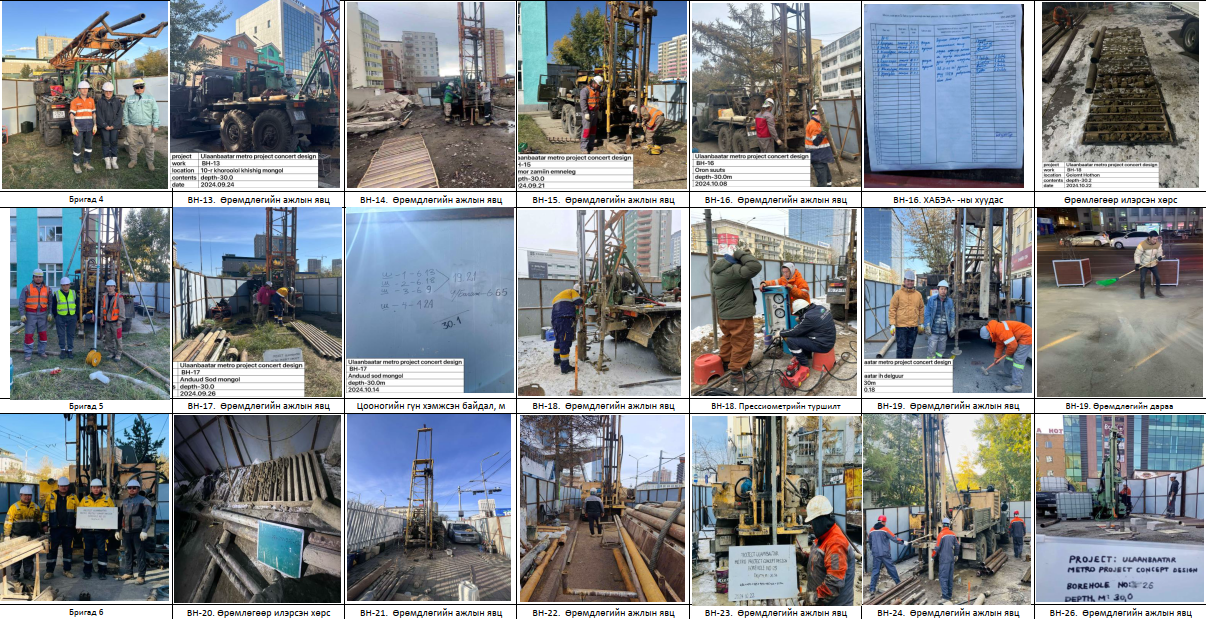 “Буурь хөрс” ХХК нь Их багтаамжтай нийтийн тээврийн хэрэгсэл “Метро”-ны төслийн менежмент, дэд зөвлөх үйлчилгээний хүрээнд “DOHWA ENGINEERING” ХХК-тай байгуулсан 2024 оны 9-р сарын 15-ны өдрийн гэрээг үндэслэн 17.7 км трассын дагуух талбайн геотехникийн судалгааны ажлыг ТЭЗҮ боловсруулах үе шатанд зориулан 2024 оны 9-р сарын 15-наас 12-р сарын 18-ны өдрүүдэд хийж гүйцэтгэв.