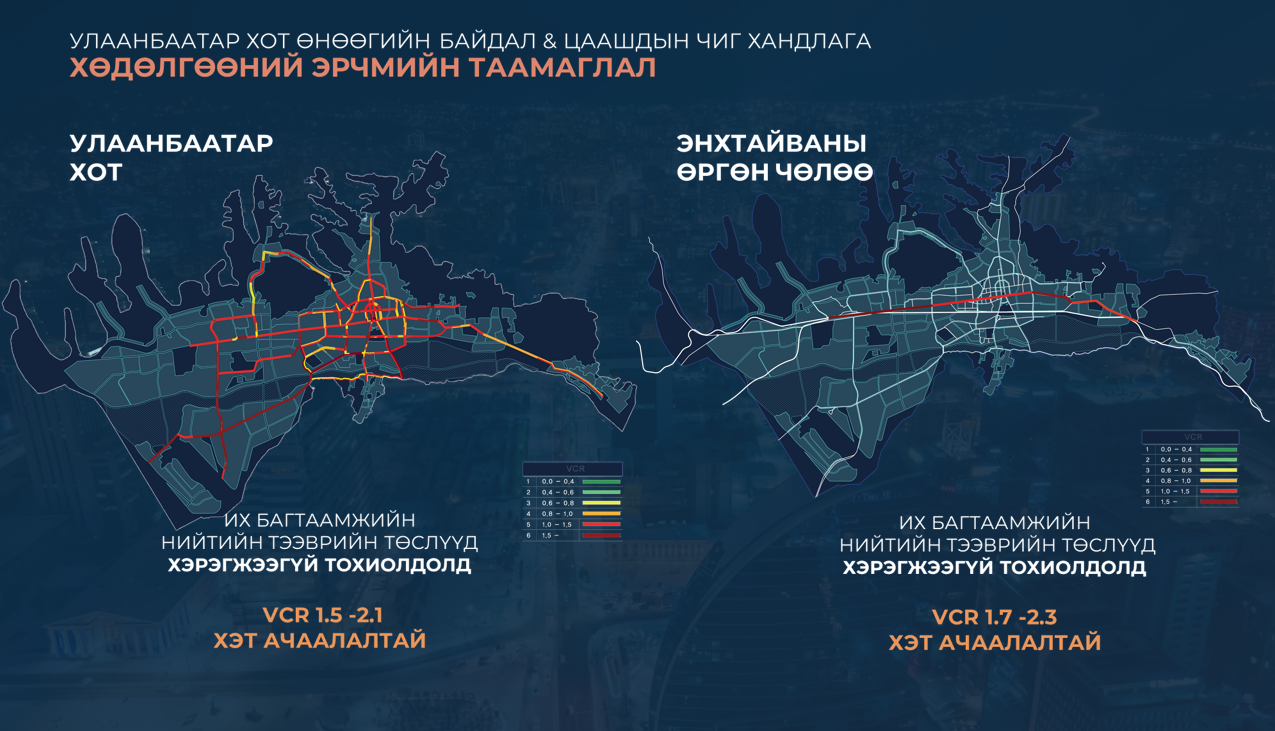Судалгааны үр дүнгээр Улаанбаатар хотод өдөрт 3.8 сая зорчилт хийгдэж замын хөдөлгөөний эрчим VCR 1.5-2.1 буюу хэт ачаалалтай байгаагаас Энхтайваны өргөн чөлөө тус зорчилтын 30%-ийг авч байгаа бөгөөд хөдөлгөөний эрчим 1.7-2.3 (хэт ачаалалтай) байна. Авто замын түгжрэлийг бууруулах чиглэлд ямар нэгэн төсөл арга хэмжээ авч хэрэгжүүлэхгүй тохиолдолд тэг зогсолт нөхцөл бүрдэхээр байна. Хэрэв их багтаамжийн нийтийн тээврийн төслүүд амжилттай хэрэгжсэн тохиолдолд 2030 оны түвшинд Улаанбаатар хотын замын хөдөлгөөний эрчим VCR 0.9-1.0 буюу хэвийн болж нийтийн тээвэрт суурилсан явган алхалтыг дэмжсэн 20 минутын хот болох боломж бүрдэх юм.