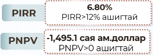Эдгээр үзүүлэлтүүд нь төслийн эдийн засгийн үр өгөөж өндөр буюу төслийг хэрэгжүүлэх нь зүйтэйг илтгэж байна.