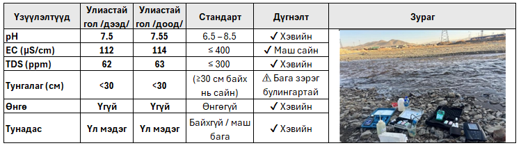 Дүгнэлт: Улиастай голын дээж нь Химийн бүрэлдэхүүнээрээ гидрокарбонатын ангийн, кальцийн бүлгийн, 1-р төрлийн, чанарын хувьд нэн цэнгэг, маш зөөлөн ус байна. Шинжилсэн үндсэн үзүүлэлтүүд нь “Усны Орчны чанар. Ерөнхий шаардлага MNS 4586:2004 стандартын шаардлага хангаж байна.