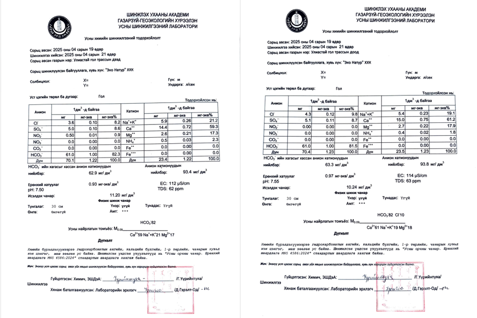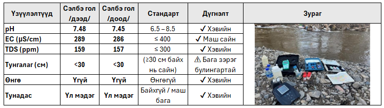 Дүгнэлт: Сэлбэ голын дээд хэсгийн дээж нь химийн бүрэлдэхүүнээрээ гидрокарбонатын ангийн, кальцийн бүлгийн, 2-р төрлийн, чанарын хувьд цэнгэг, зөөлөн ус байна. Шинжилсэн үндсэн үзүүлэлтүүд нь “Усны орчны чанар. Ерөнхий шаардлага MNS 4586:2024” стандартын шаардлага хангаж байна.