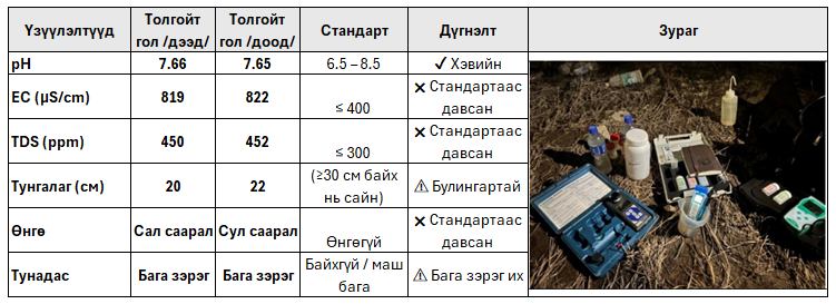 Энэхүү шинжилгээ нь усны чанарын одоогийн нөхцөлийг тодорхойлохын зэрэгцээ төслийн хэрэгжилтийн явцад үүсэж болзошгүй өөрчлөлтийг хянах үндсэн суурь мэдээлэл болно.