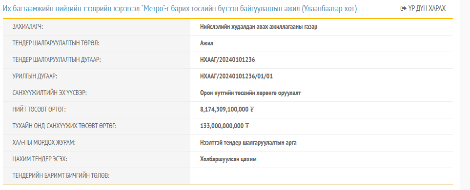 2025 оны 12-р сарын 24-нд НХААГ/20240101236 дугаартай Их багтаамжийн нийтийн тээврийн хэрэгсэл "Метро"-г барих төслийн бүтээн байгуулалтын ажил (Улаанбаатар хот)-ын 2-р үе шатны Тендер зарлагдсан ба 2026 оны 07-р сарын 03-нд нээхээр төлөвлөж байна. Нийслэлийн засаг даргын тамгын газар нь тендер шалгаруулалтын нэгдүгээр үе шатад оролцсон оролцогчийг хоёрдугаар үе шатад тендер ирүүлэхийг урьж байна.