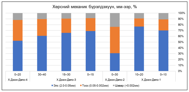 Дүгнэлт: Төслийн талбайн хөрс нь хотжилтын нөлөөгөөр өөрчлөгдсөн, шүлтлэг шинж давамгай боловч шинжлэх ухааны ангиллаар “шавранцар” төрөлд багтах бөгөөд энэ нь хөрсний бат бэх чанар ба сийрэгжилтийн зохистой харьцааг илэрхийлж, барилгын ажилд тохиромжтой нөхцөл бүрдүүлж байна.