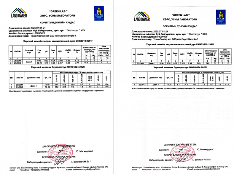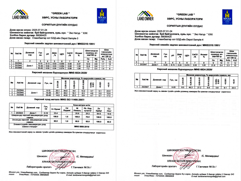 Дүгнэлт: Төсөл хэрэгжих талбайн хөрс нь хотын суурьшлын бүсийн нөлөөгөөр өөрчлөлтөд орсон, шүлтлэг шинж чанар давамгайлсан үзүүлэлттэй байна.