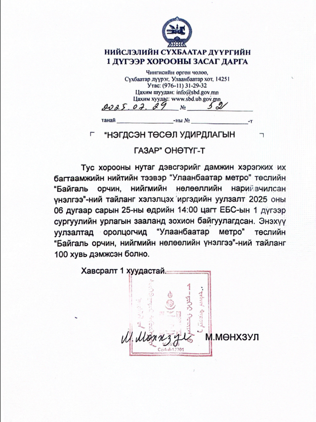 УЛААНБААТАР МЕТРО БА ИРГЭД: БОННҮ ТАЙЛАНГ СҮХБААТАР ДҮҮРГИЙН ИРГЭДЭД ТАНИЛЦУУЛЛАА
